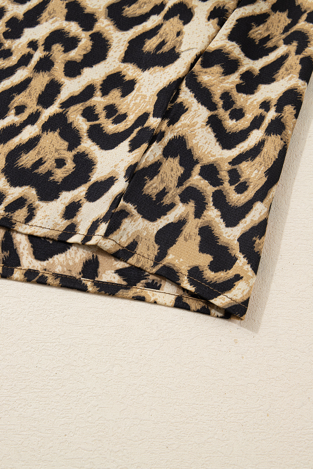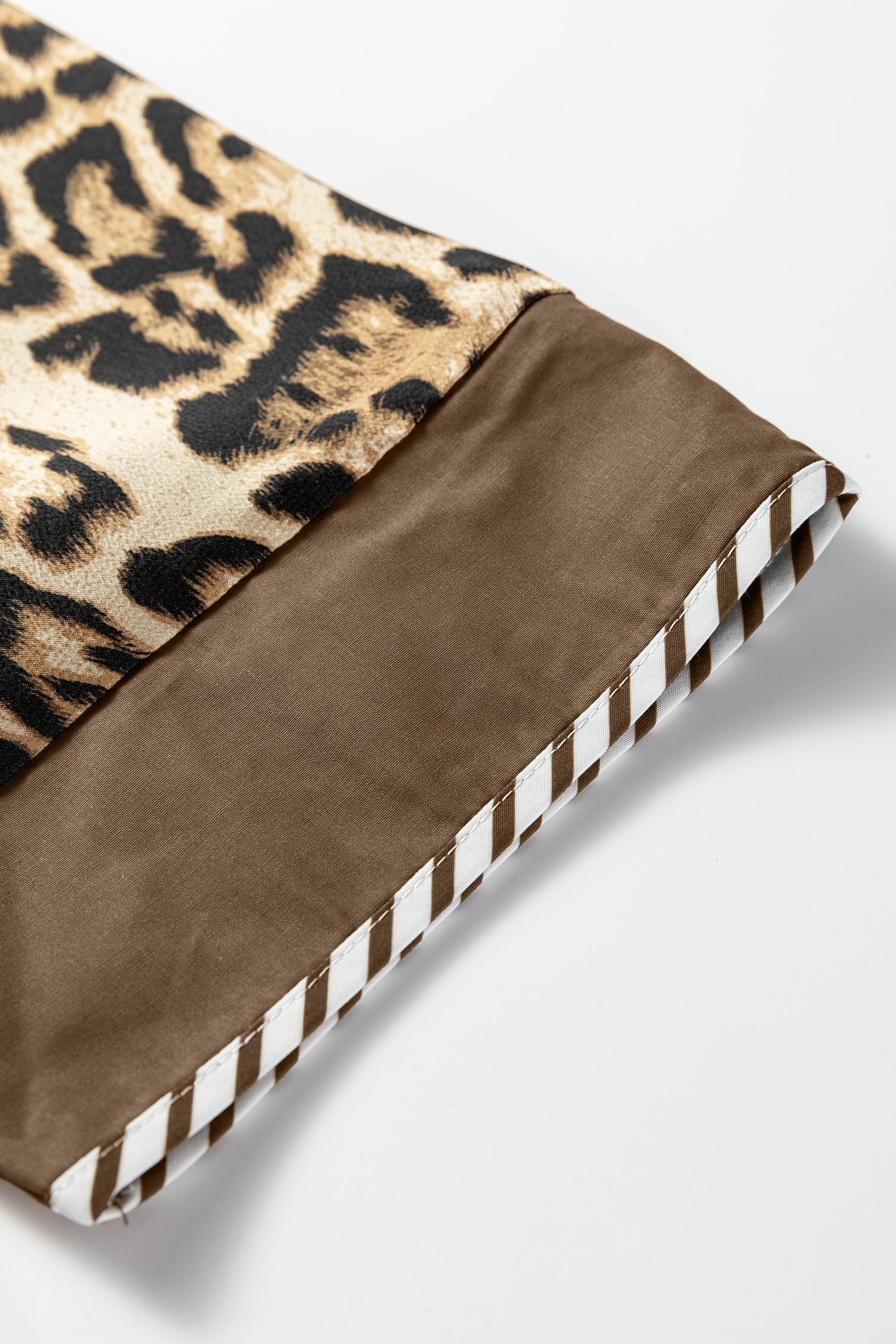 Brown Leopard Collared 3/4 Sleeve Shirt and Loose Pants Two Piece Outfit Set