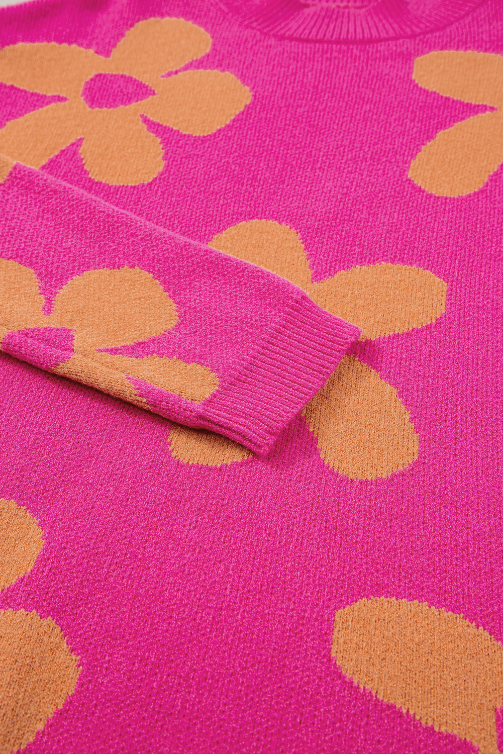 Rose Big Flower Pattern Mock Neck Long Sleeve Sweater