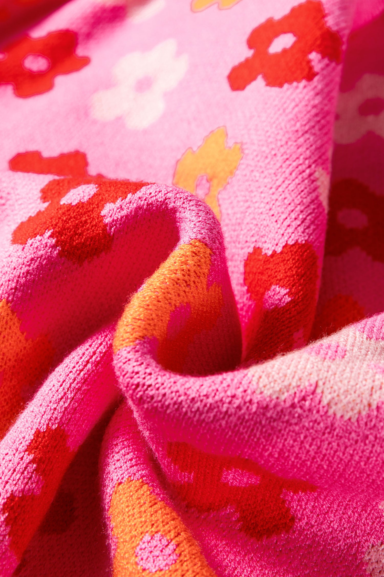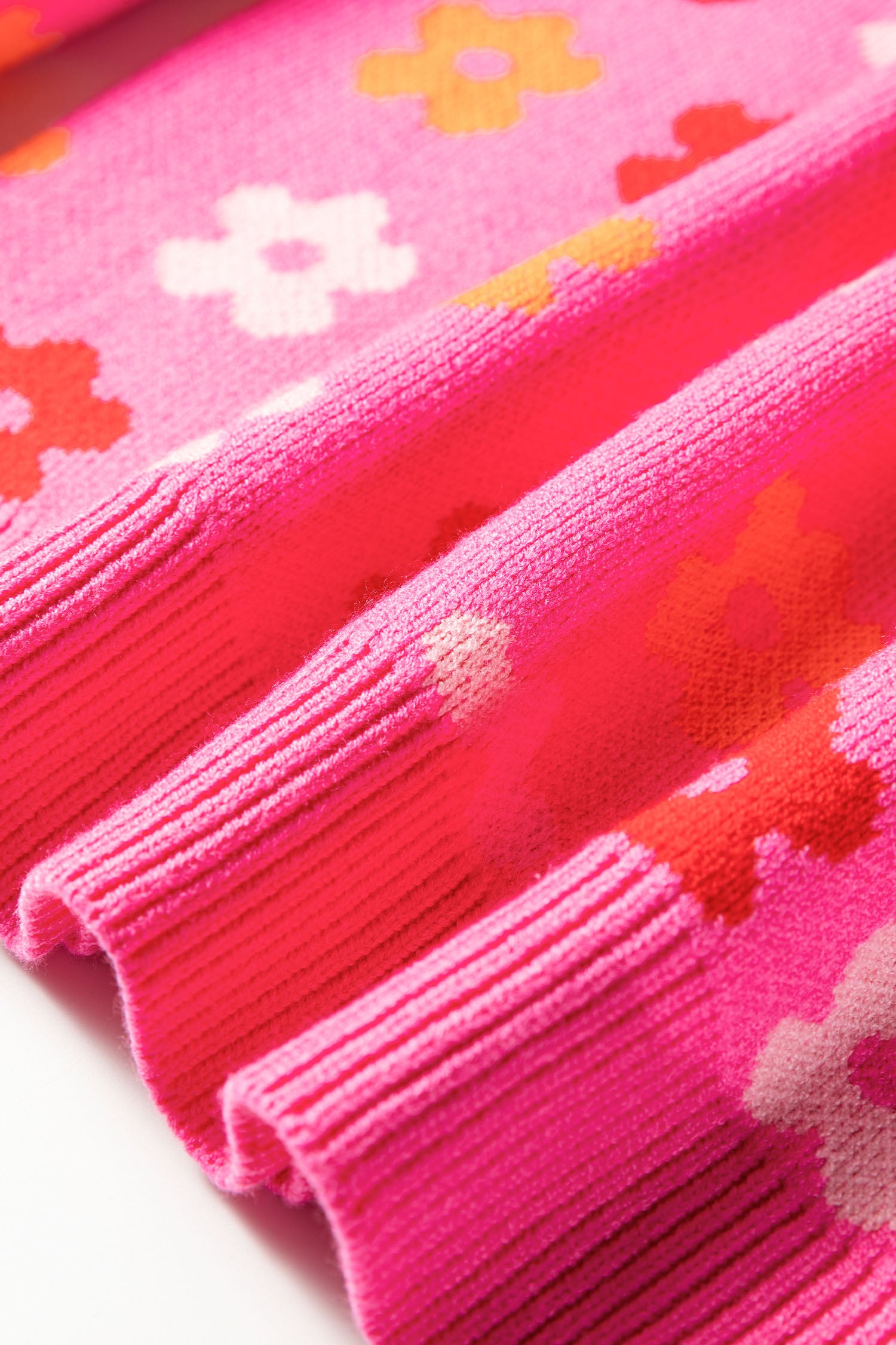 Rose Cute Flower Allover Ribbed Trimmed Drop Shoulder Pullover Sweater