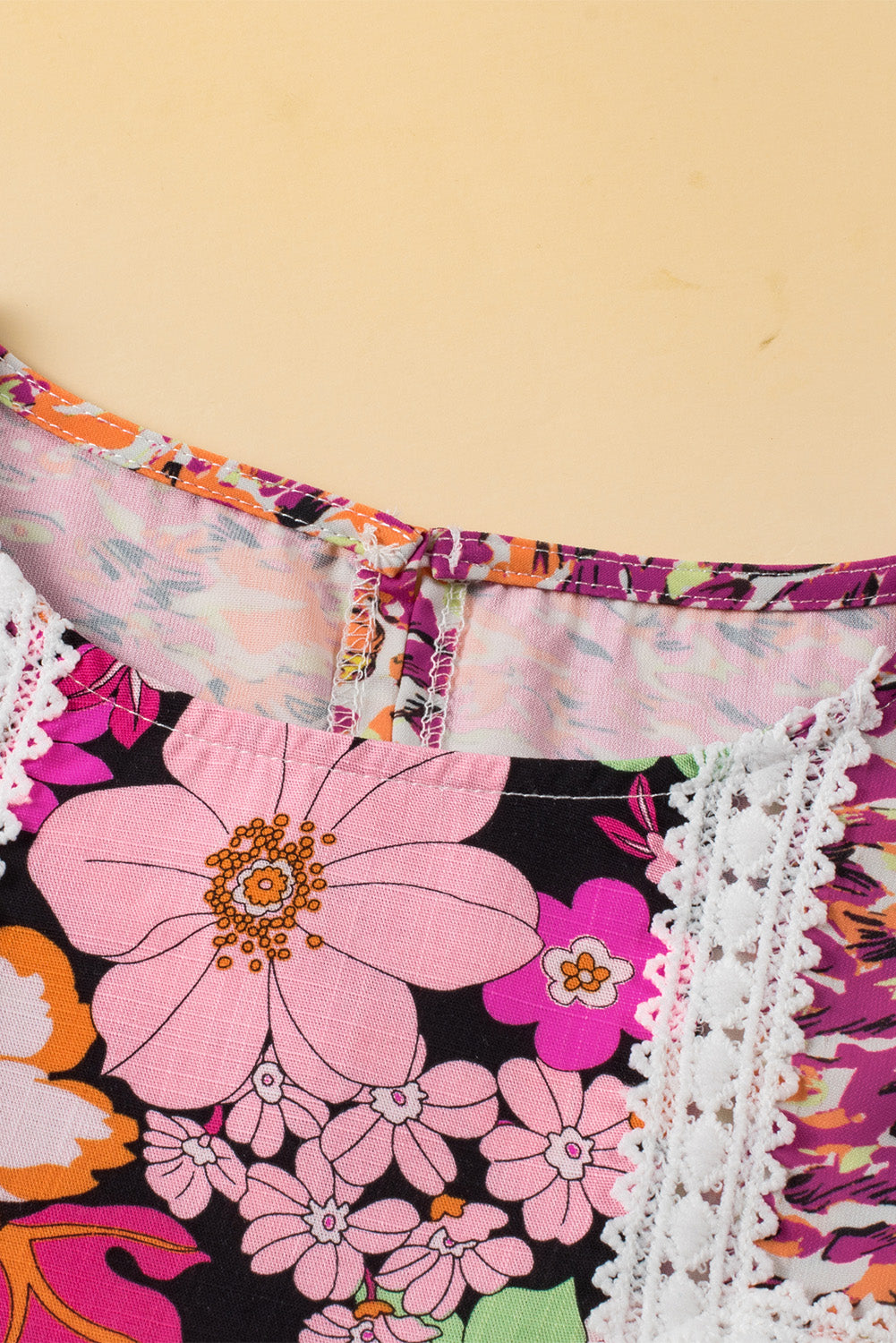 Rose Red Bubble Sleeve Lace Trim Floral Mixed Print Blouse