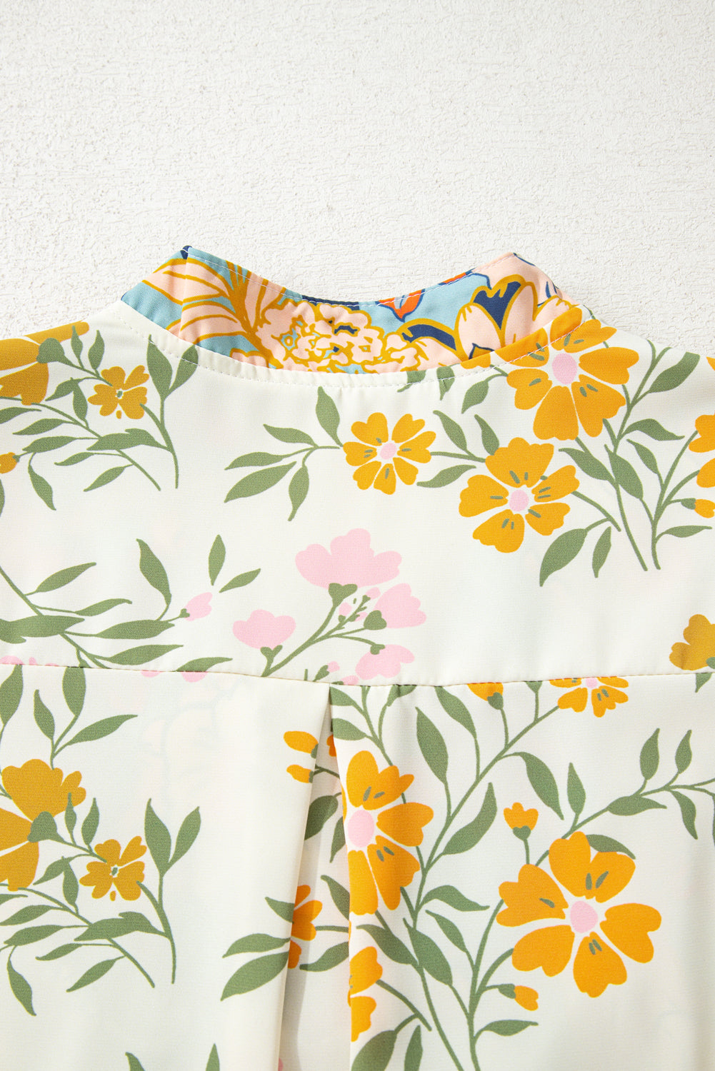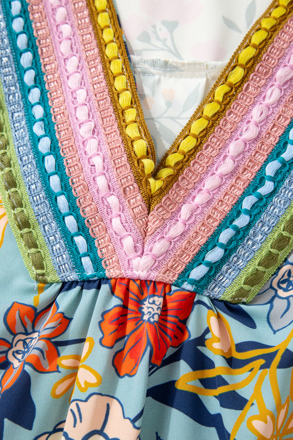 Sky Blue Floral Print Ruffled Long Sleeve Crochet Trim V Neck Blouse